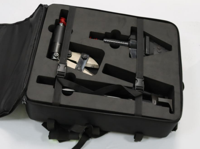背負式電動液壓工具組以電動泵為動力,重量輕,作用力大,效率高。單手操作模式,實現在狹小空間里更加靈活的使用工具;電動液壓泵具有二級壓力輸出,根據外接負載的變換自動轉變壓力;電動液壓泵作為液壓動力源與組件中其他工具配套進行破拆作業;撬棍可單獨進行起釘及撬拆工作;邊緣抬升器底腳與油缸的螺旋槽可以增大開門距離,需要時可擰出;邊緣抬升器的分離槽有防滑功能,可分離易打滑的框架結構;微型剪切器尺寸小、重量輕,剪切力大,能剪斷直徑18mm的圓鋼;套組工具接口均為單管平接口,平面密封,具備鎖止功能和防塵裝置;套組采用線控方式操作,超大控制按鈕,操控方便、簡單;具有定位功能,更適合精確操作。